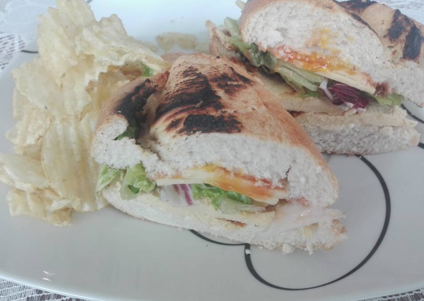 - En la tapa añade el queso y sobre el pollo la lechuga, cierra y corta por la mitad de manera diagonal, puedes acompañar con papitas fritas como yo... mmm! En un dos por tres una rica comida!