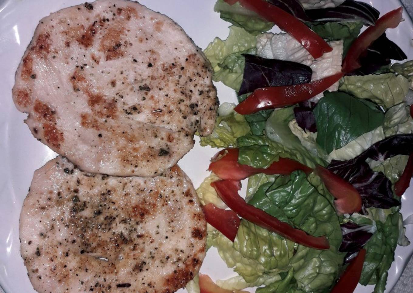 - Revuelve todas las especias, y agrega al pollo. Frota muy bien por ambos lados, calienta poquito aceite y agrega el pollo. Voltea según como te guste el terminó, a mi me gusta bien cocido, y listo. Acompañé con una fresca ensalada,
